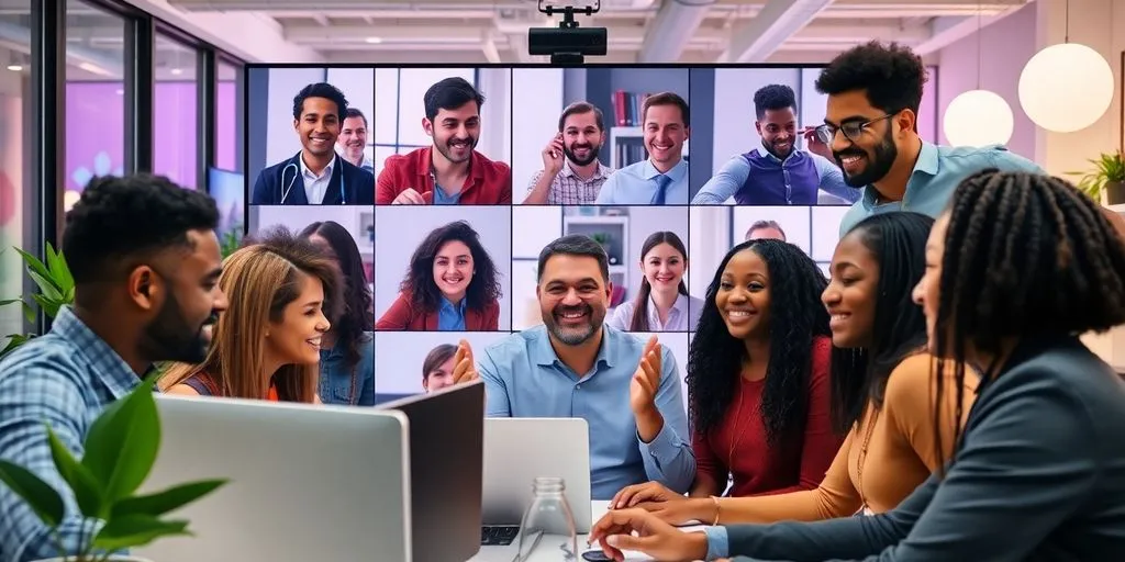 Diverse team in a lively video conference meeting.